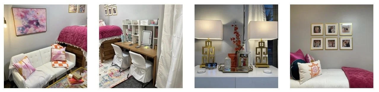 Starting with a big beautiful rug is essential! The rug allows you to build your dorm room design from the ground up and sets the stage for your overall look. This room was created in Magnolia Hall at the University of Tennessee.